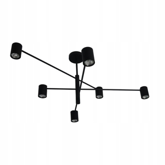Lampa 6 x spot GU10 to stylowa lampa sufitowa z sześcioma źródłami światła. Wykonana została z wysokiej jakości metalu w kolorze czarnym. Klosze lampy mają możliwość regulacji kąta padania światła. Oprawa będzie idealnym wyborem do wnętrz urządzonych w nowoczesnym stylu. Wysokość lampy to: 44,5 cm, szerokość 80 cm. Źródłem światła jest żarówka typu GU10 o mocy max 50W w ilości 6 szt.