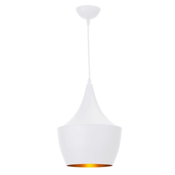 Caselle wisząca biała - to piękna lampa, która swoją budową aluminiowego klosza przypomina - namiot cyrkowy. Nie jest ona jednak kolorowa czy zabawna! Wręcz przeciwnie, jej kolory są stonowane, gustowne i eleganckie. Cała jej wierzchnia strona jest koloru białego a elegancji dodaje jej złoty kolor, który znajduje się wewnątrz klosza. Ta szykowna propozycja oświetlenia, będzie także dekoracją pokoju, salonu czy kuchni w ekskluzywnym wydaniu. Znakomicie sprawdzi się także w pomieszczeniach komercyjnych, takich jak: gabinety kosmetyczne, fryzjerskie, czy w SPA. Lampa Caselle, uraczy Was jednym źródłem światła, które cudownie będzie rozpromieniać się na złotym tle. Długość przewodu tego produktu wynosi 130 cm, ale dla wygody i praktyczności przy niższych pomieszczeniach, bez problemu można ją skrócić.
