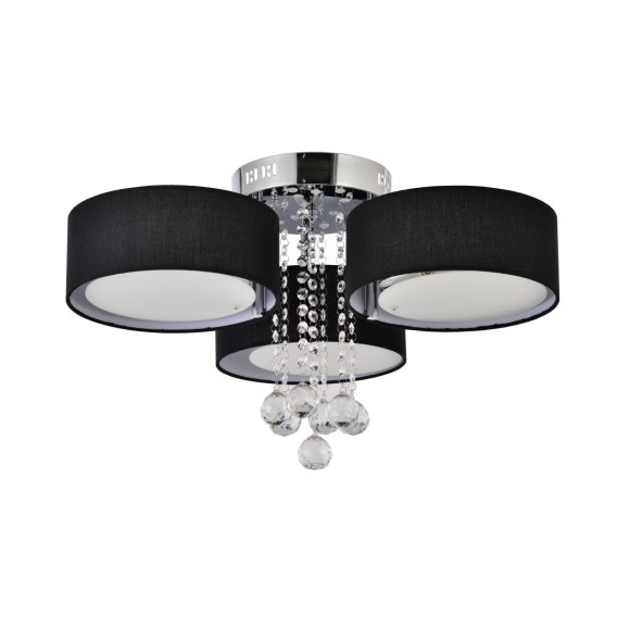 Plafon z kolekcji Gambela w czarno - srebrnym kolorze, utrzymany w stylu glamour. Plafon posiada akrylowe, transparentne kryształki imitujace szkło. Lampa przeznaczona jest na trzy żarówki o gwincie E27. Posiada również zintegrowane źródło światła LED.